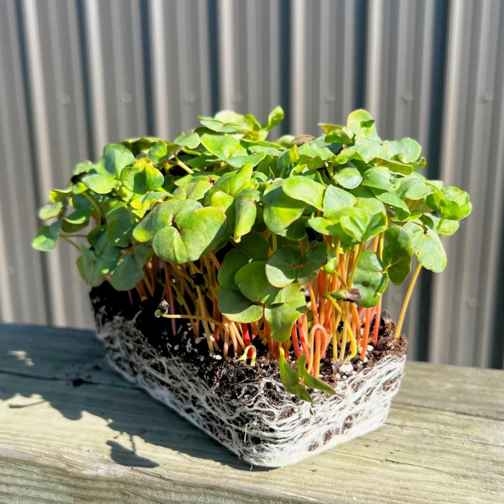 Buckwheat microgreens have light green leaves with pinkish stems, a slightly tangy and nutty flavor, and a soft, crunchy texture. They are grown without soil in trays filled with coco coir, hemp mats, or organic compost, requiring only water and indirect light to thrive.