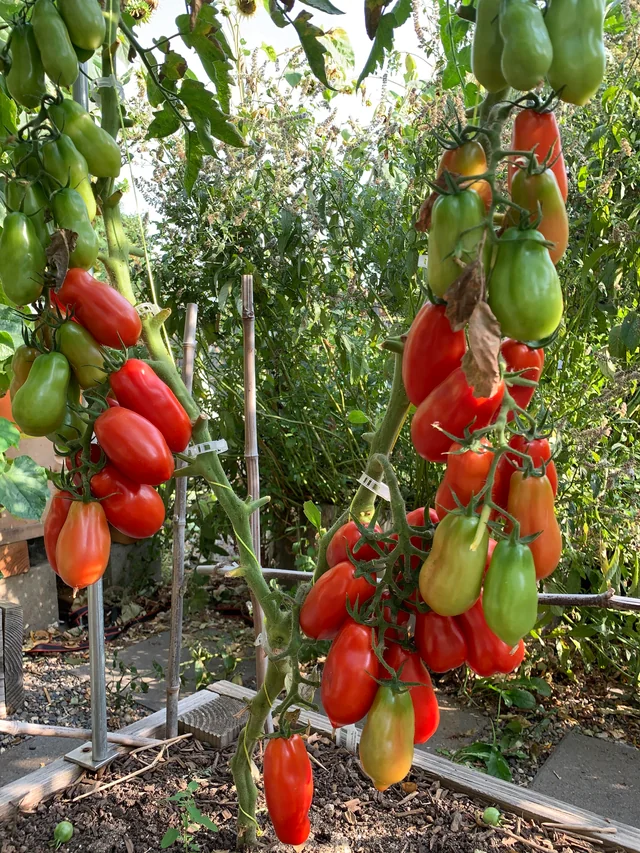 Roma tomatoes are ready to harvest when fully colored, firm, and slightly soft to the touch. Regular harvesting encourages continuous production.
